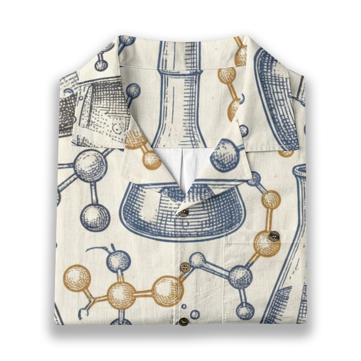 This unique Hawaiian shirt features a vintage chemistry laboratory illustration filled with flasks, molecular diagrams, and scientific sketches.