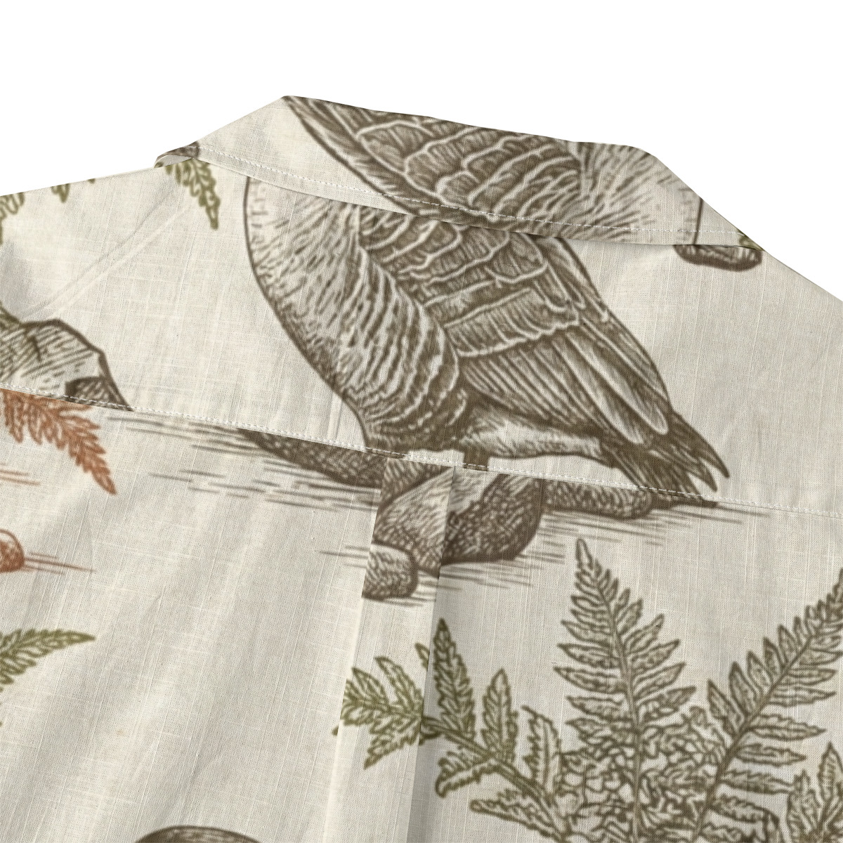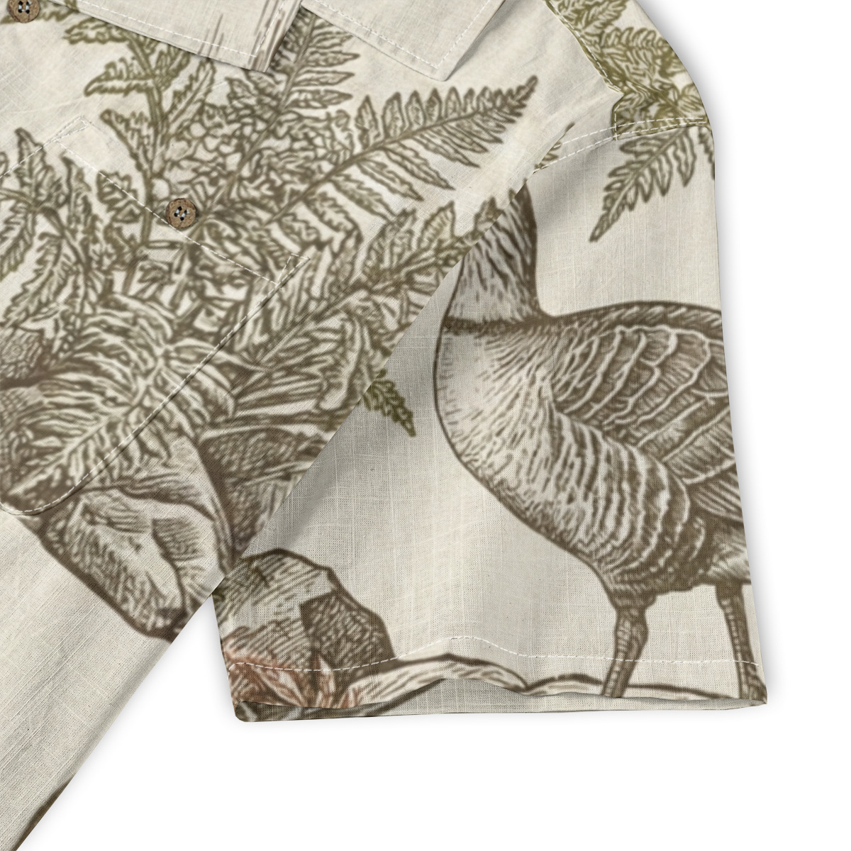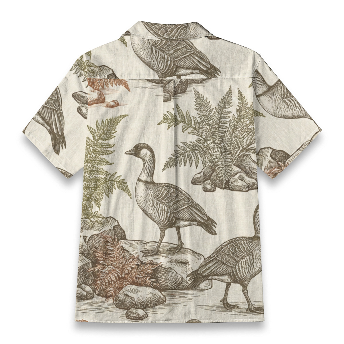- This Hawaiian shirt features an elegant all-over illustration of geese set among ferns and natural elements, inspired by classic vintage engravings.