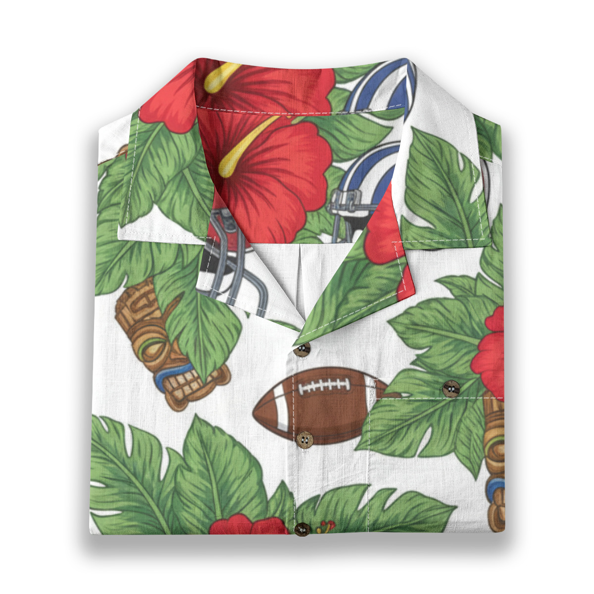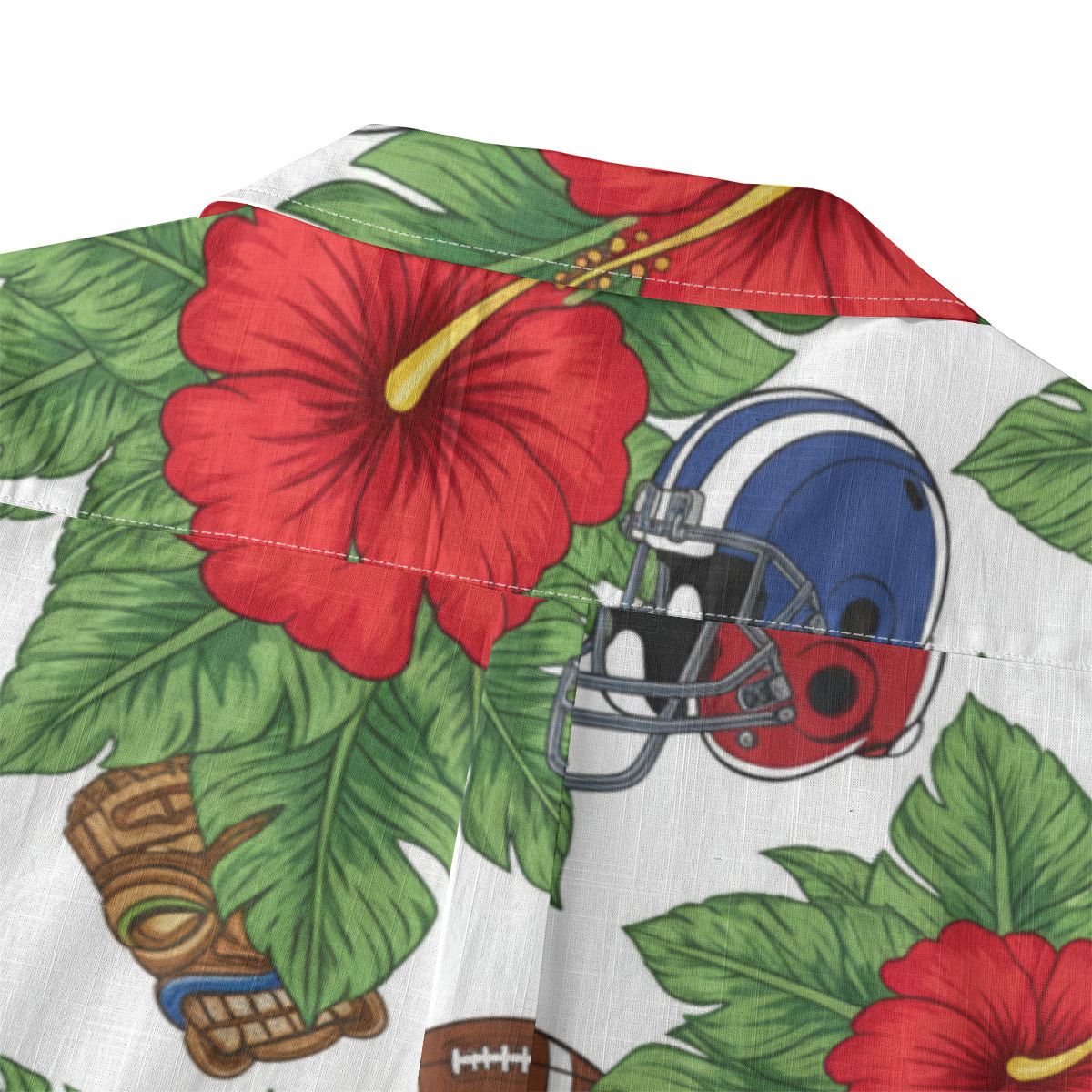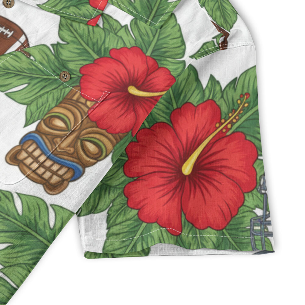 A football helmet and a tiki mask share the same tropical backdrop in a print that mashes up hard-hitting sport with ancient island culture. It sounds like it shouldn't work, but somehow it absolutely does, creating a design that feels bold and original. This one is for someone who takes both game day and island style equally seriously.