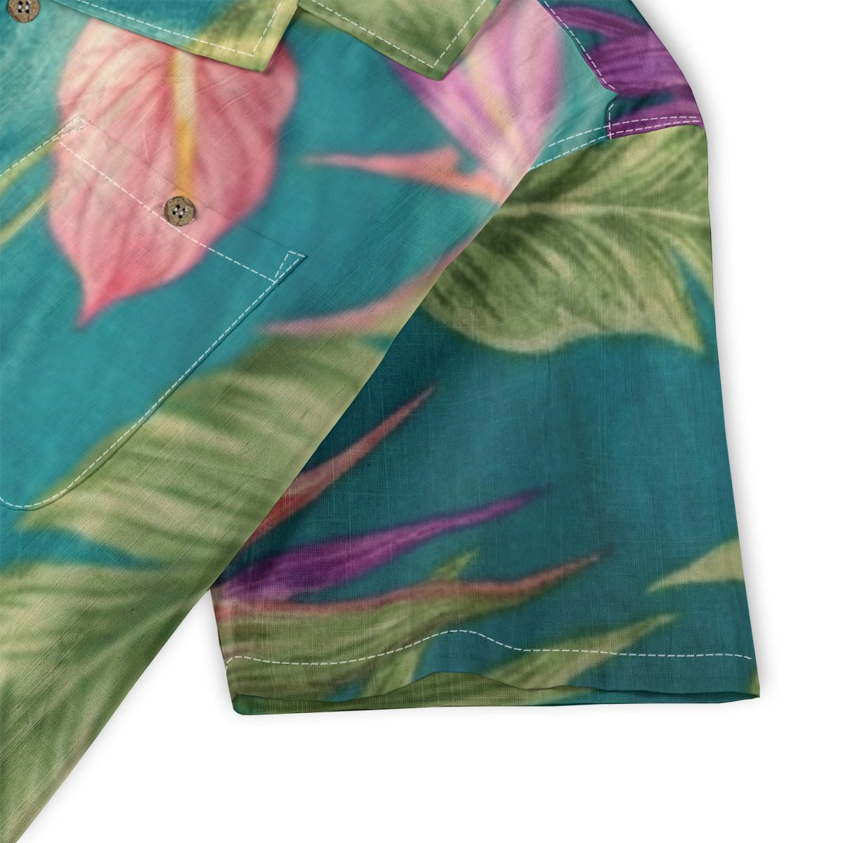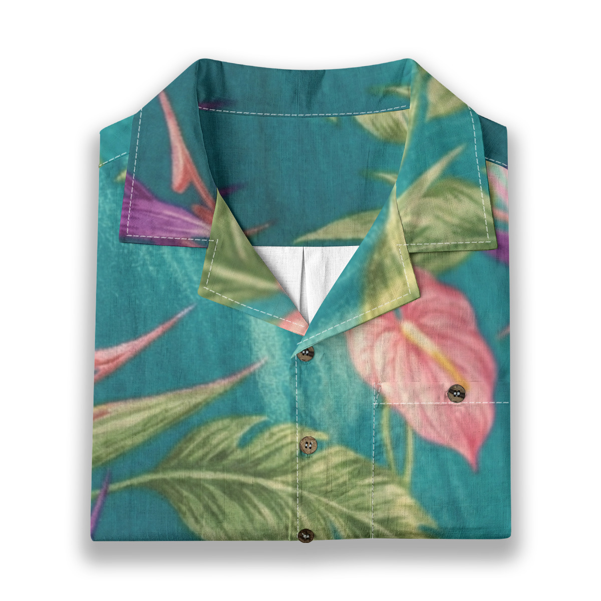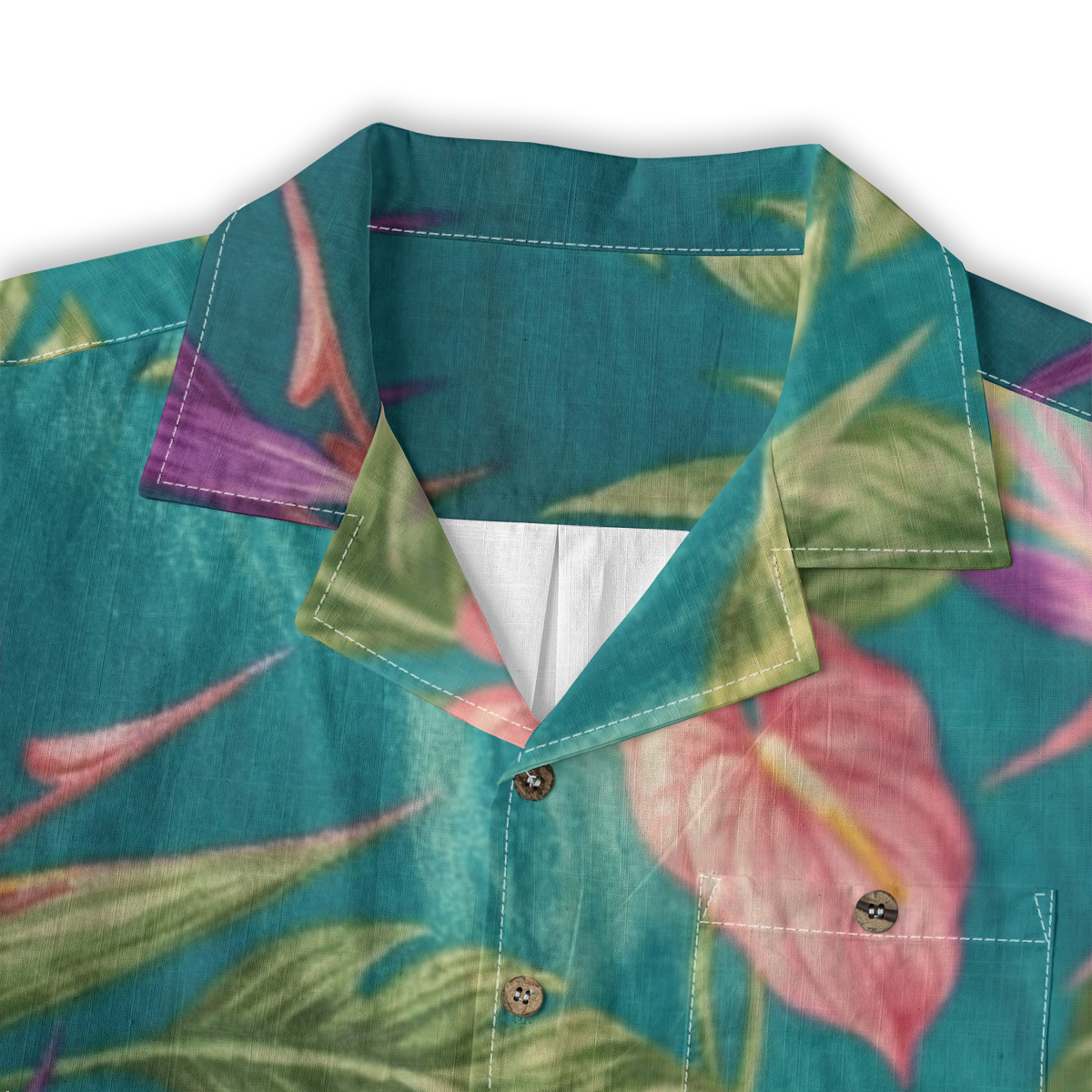 Bring rich tropical depth to your style with this teal anthurium and palm Hawaiian shirt.