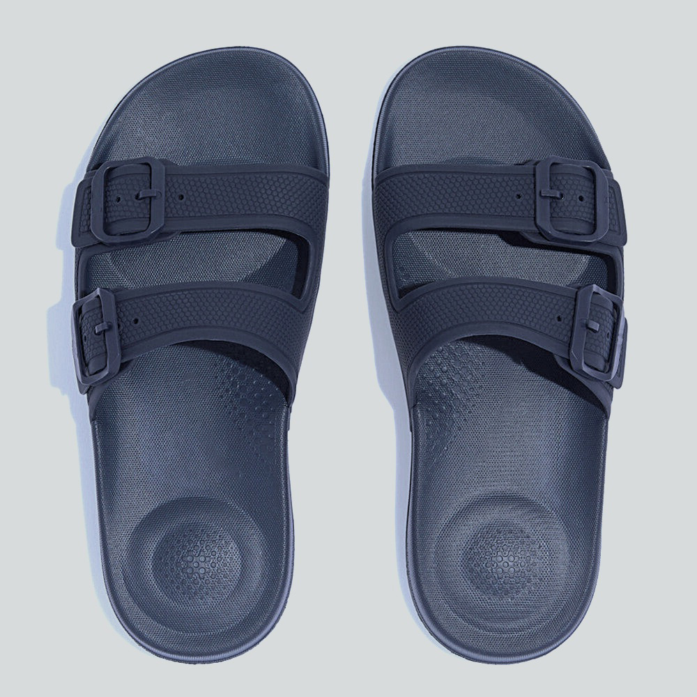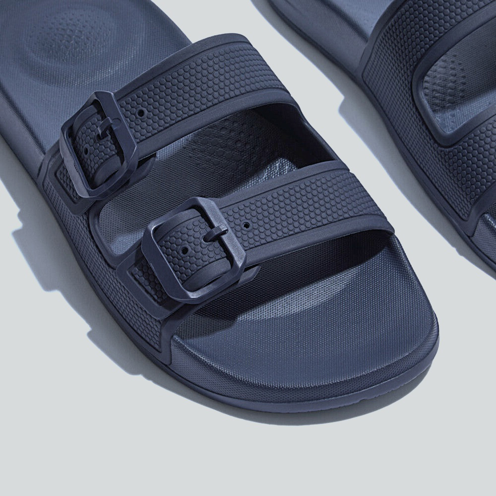 Sporty two-bar slides built for everywhere—water to sidewalk. Adjustable buckles lock in the fit; textured ShieldGrid panels add structure without bulk. Contoured CloudCush footbed softens impact and supports natural arch. Slip-resistant outsole and quick-dry SplashLite build keep you steady in midnight navy.