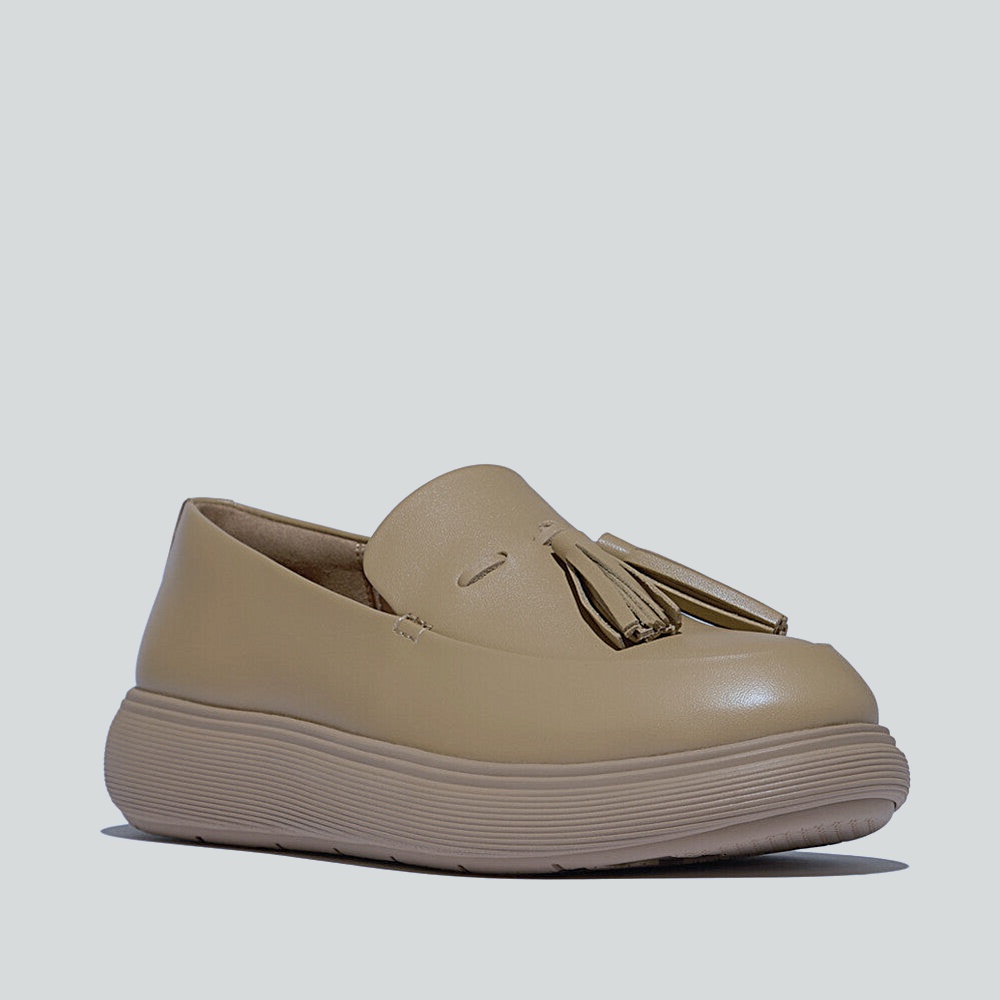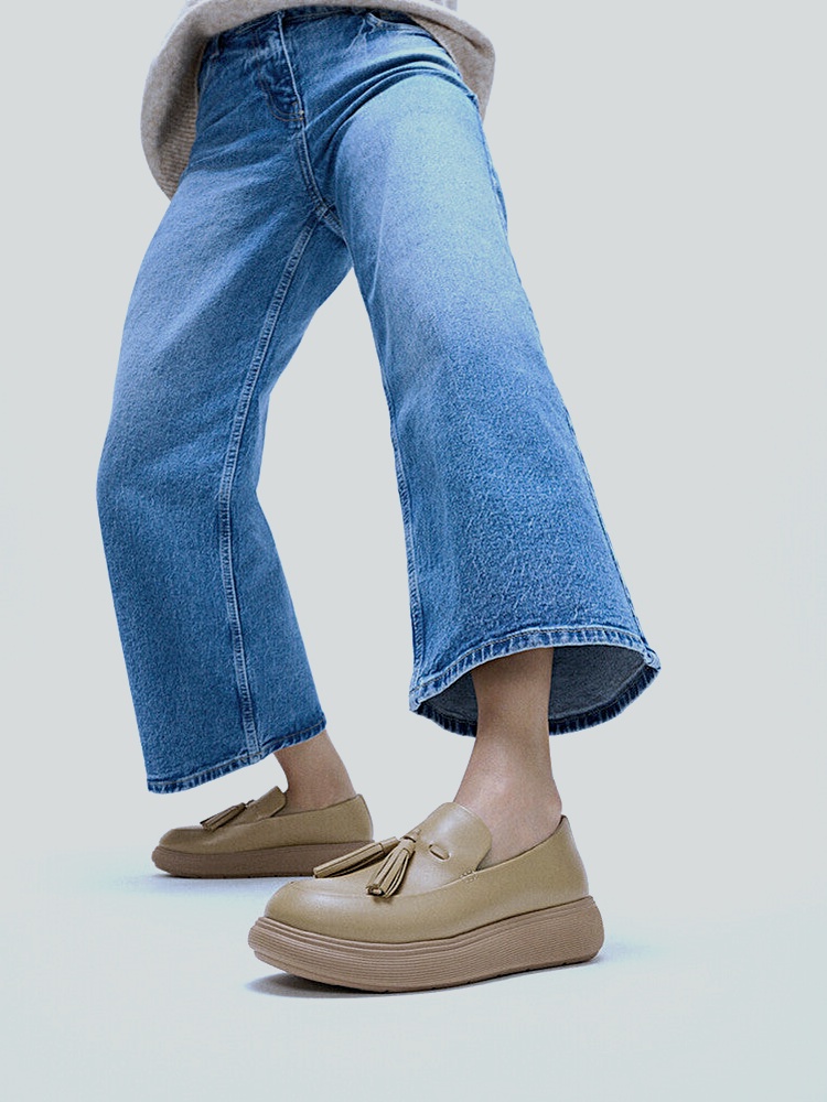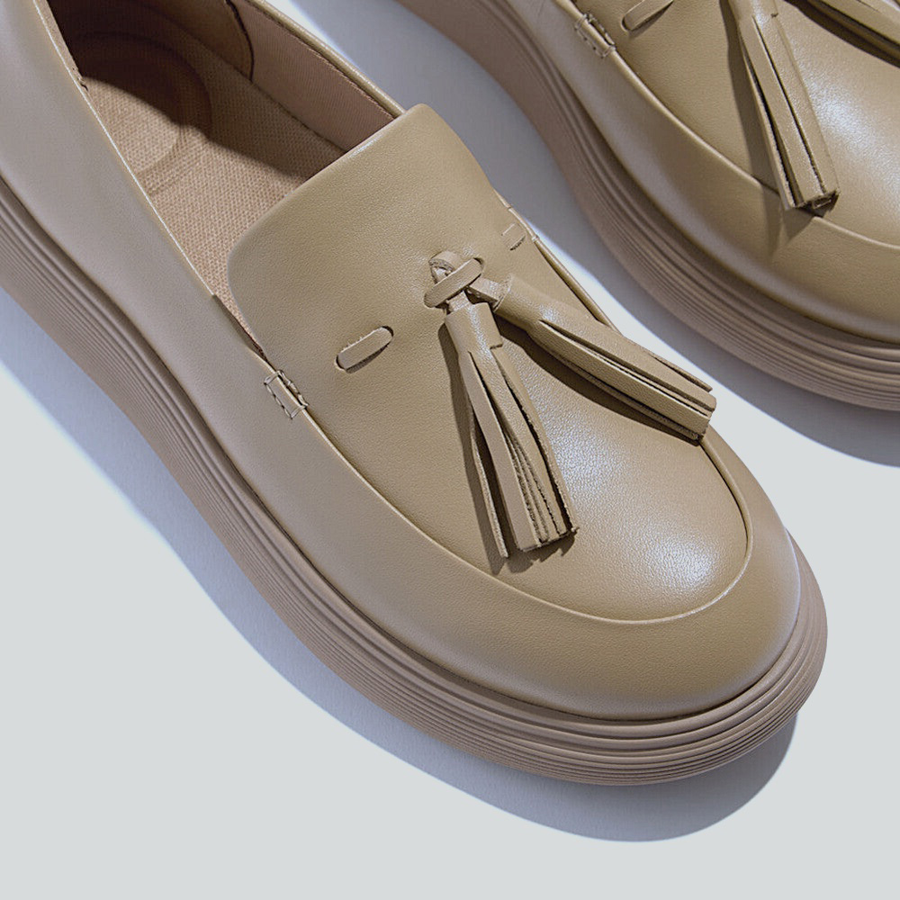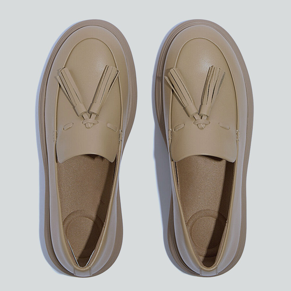 Modern tassel loafer on a sleek lightweight platform. Smooth ShadeSkin upper with clean minimal stitching and an easy slip-on cut. CloudGlide midsole diffuses pressure and supports a natural stride; cushioned footbed and soft heel cup keep the fit secure. Slightly squared toe feels polished yet relaxed. RippleFlex rubber outsole adds quiet traction in classic camel.