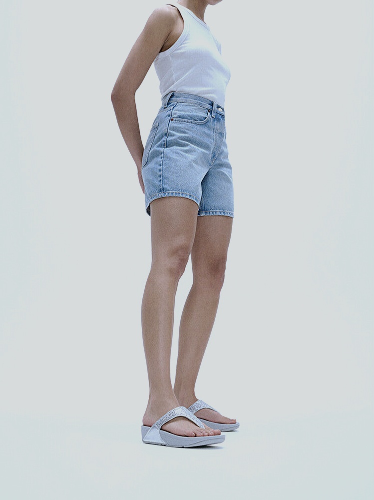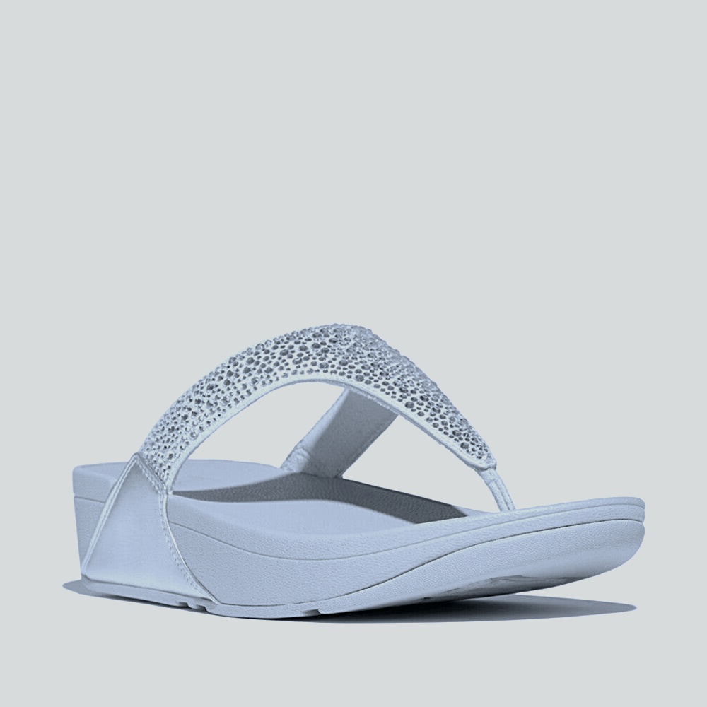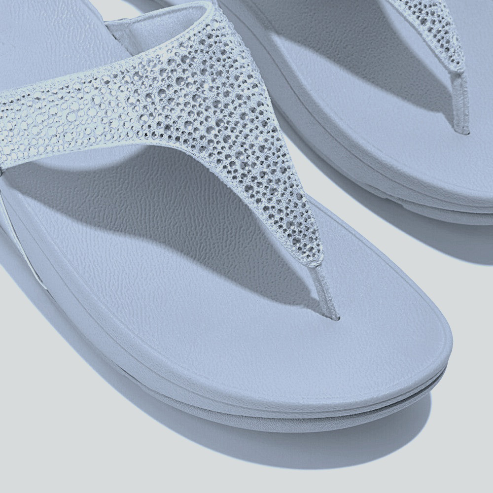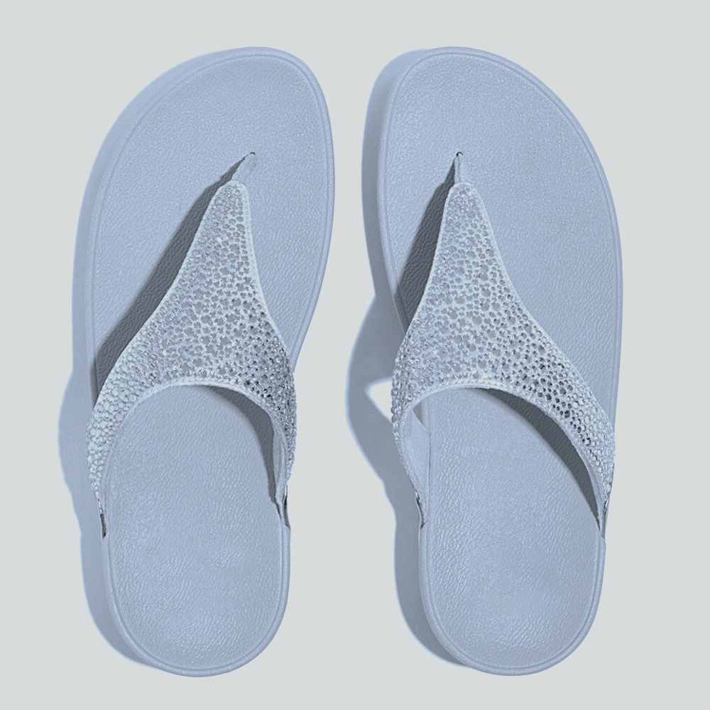 Slim V-strap toe-post with a StarDust upper that sparkles from every angle. Sleek wedge platform gives elegant lift while staying feather-light. CloudFoam midsole diffuses pressure and supports the natural arch for all-day ease. Soft toe post and smooth lining prevent rubs; gentle toe-spring keeps steps flowing. Micro-grip outsole stays steady from brunch to evening glow, finished in cool silver.