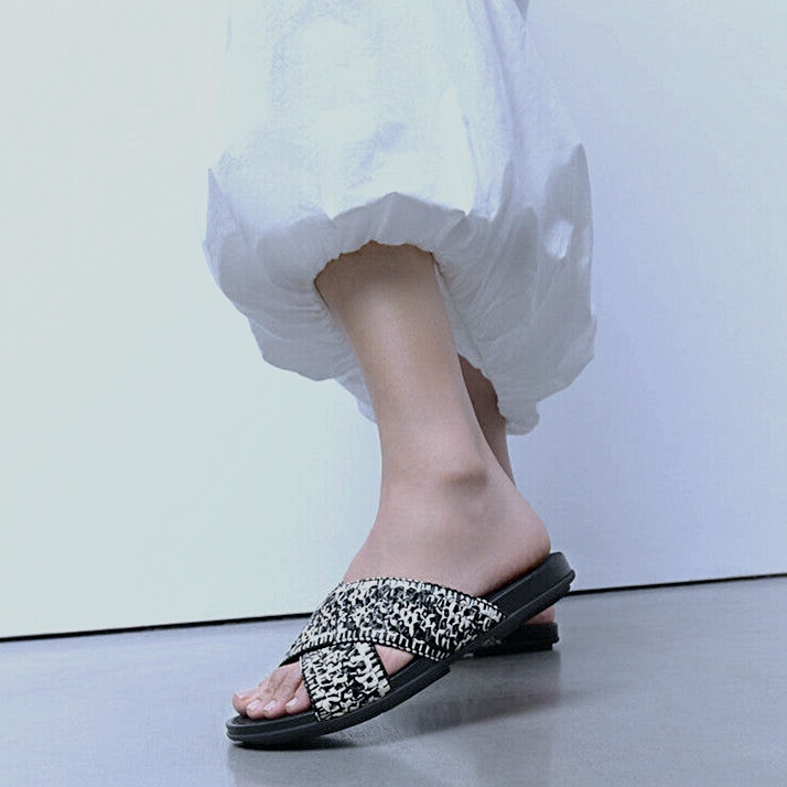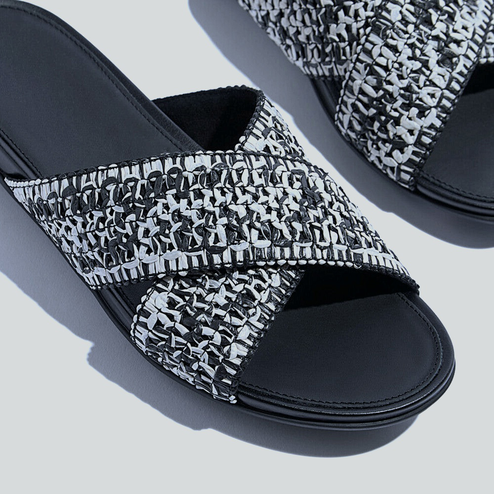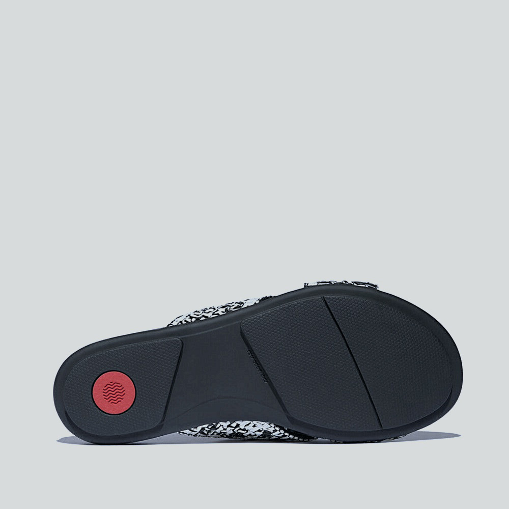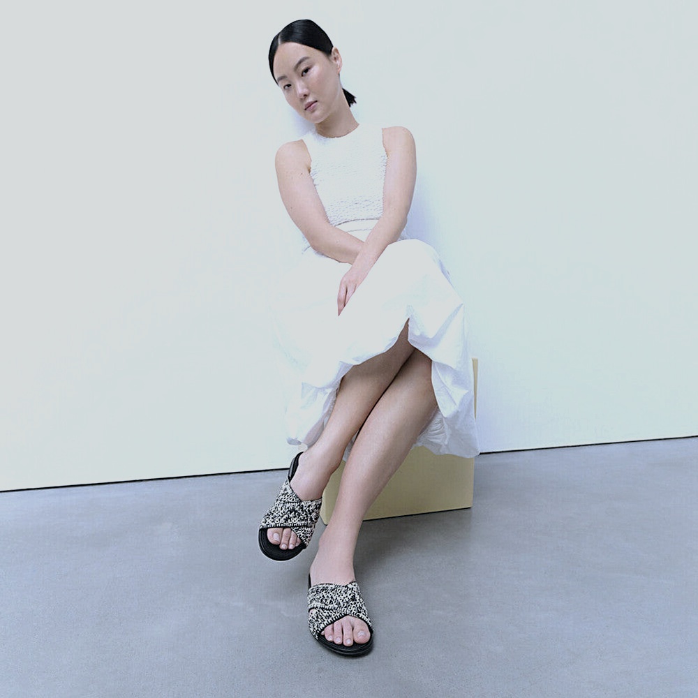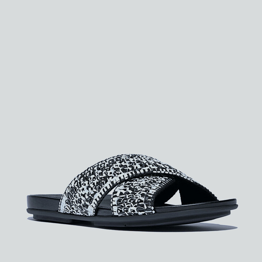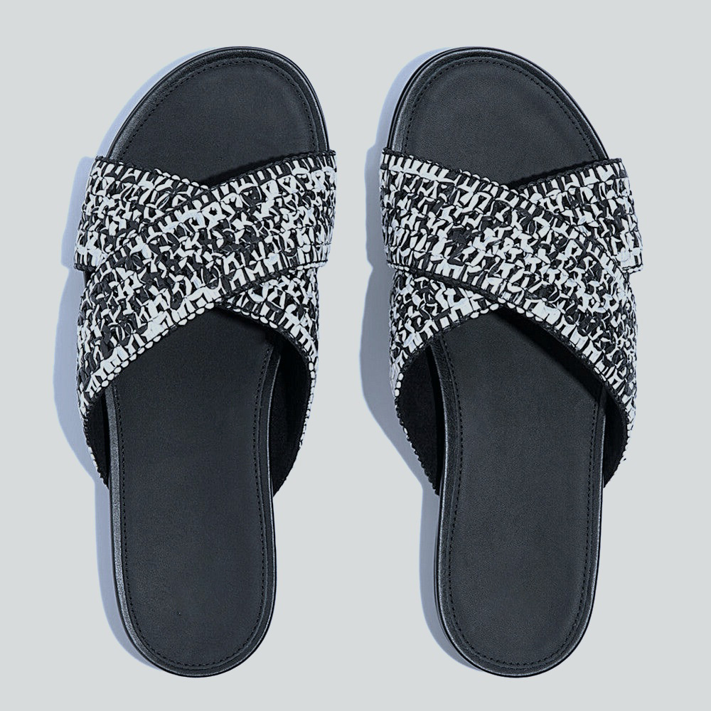 Cross-strap slide with a monochrome MosaicWeave upper that hugs the foot without bulk. Low-profile Dynamicush™ footbed diffuses pressure and flexes naturally for effortless walking. Smooth edges prevent rubs; gentle toe-spring keeps steps flowing. Micro-grip outsole adds quiet traction in a black–ivory mix.
