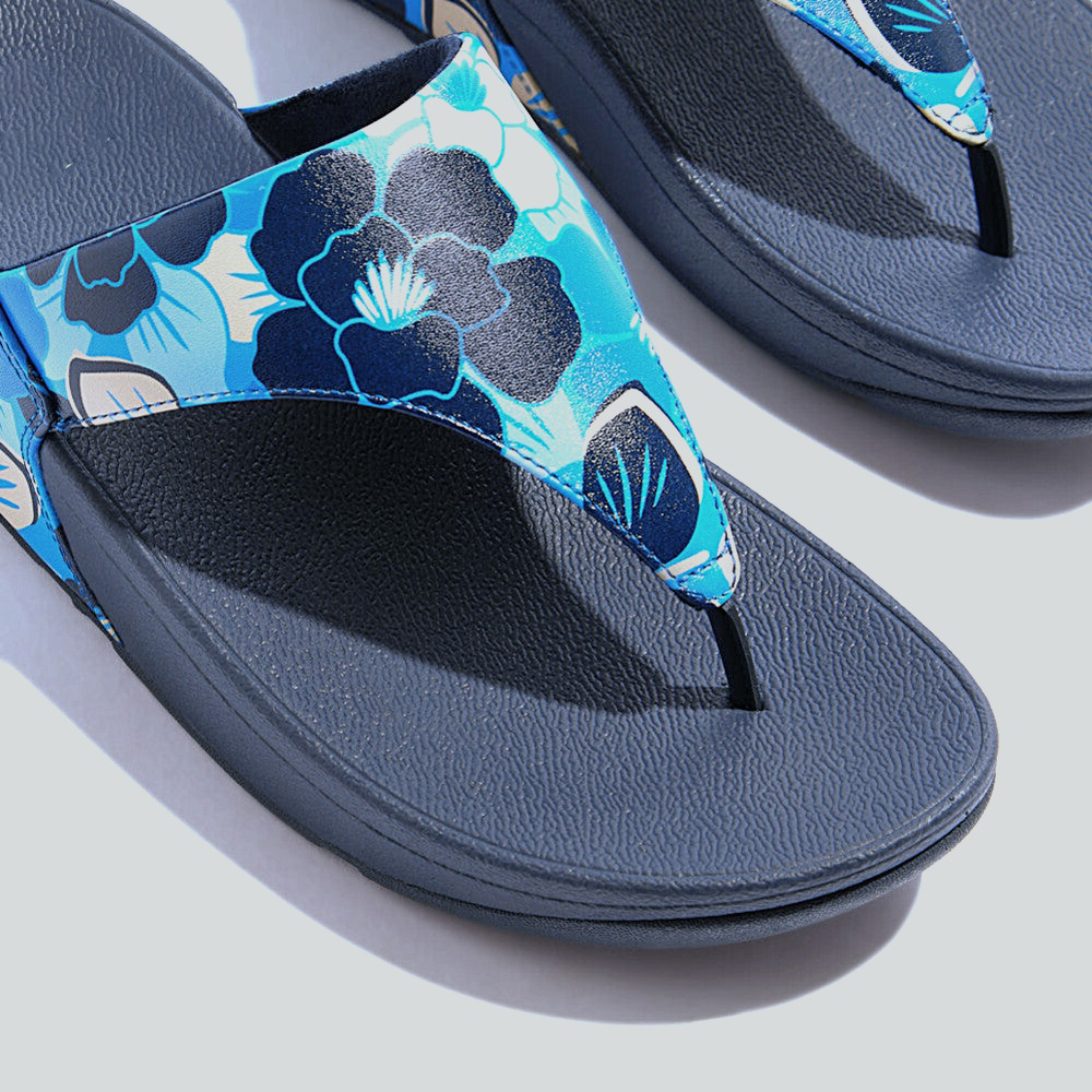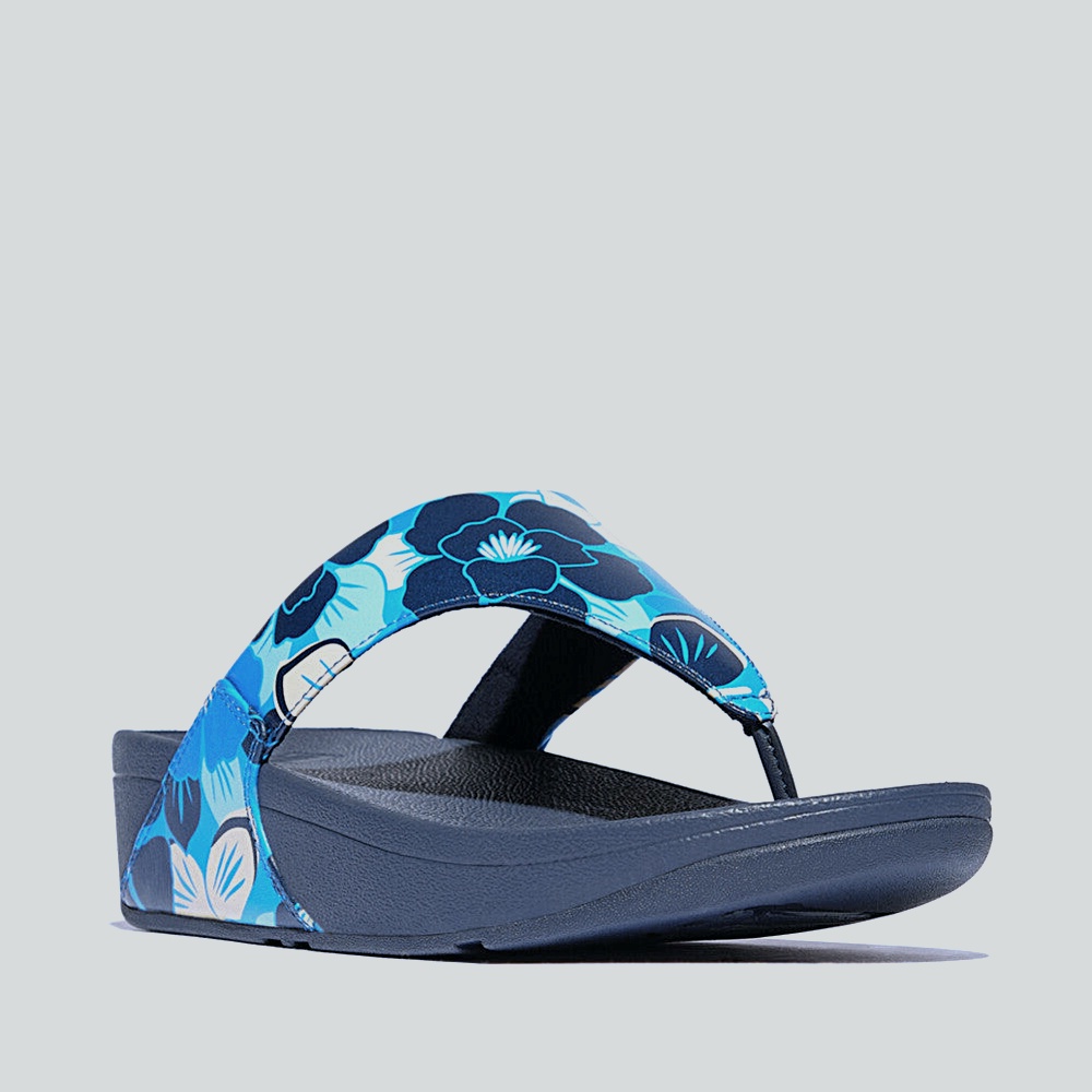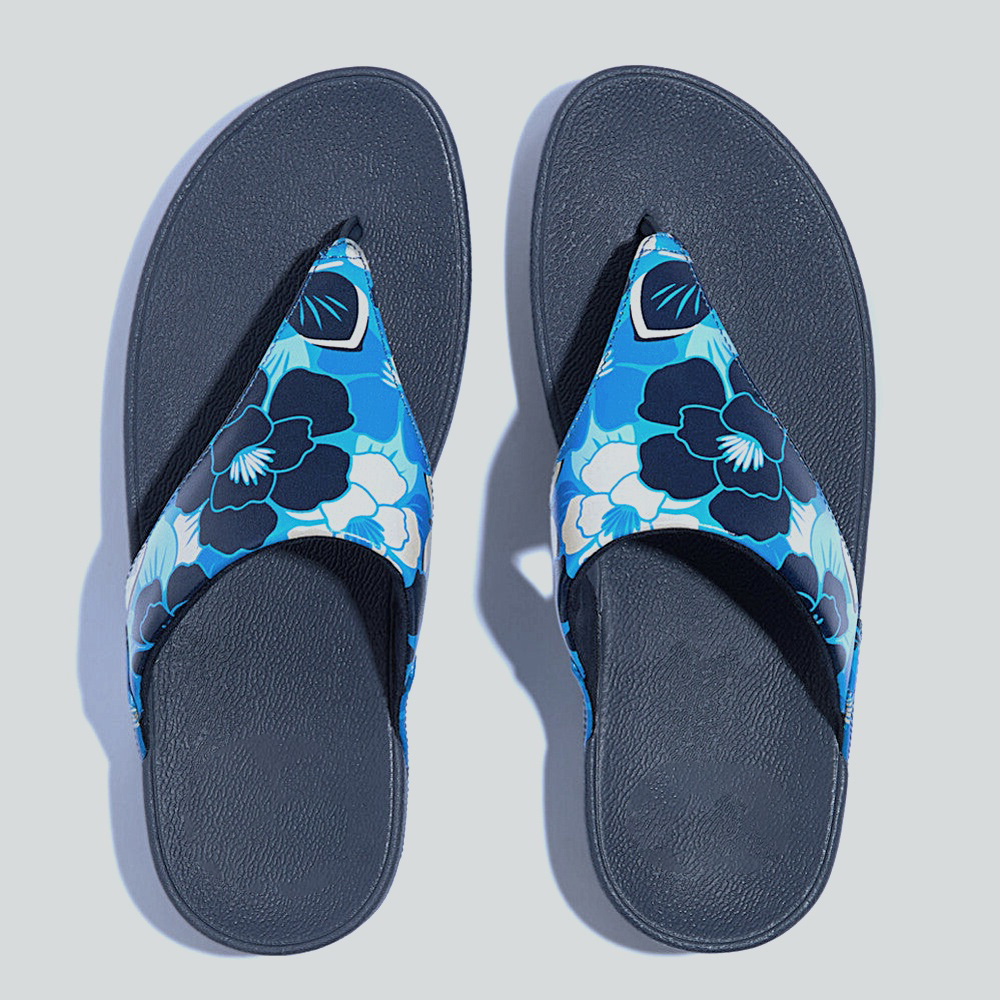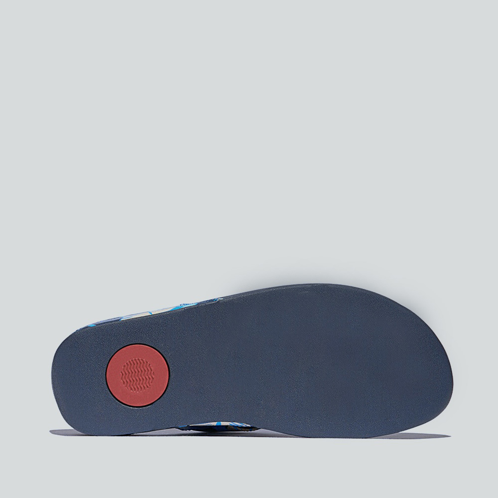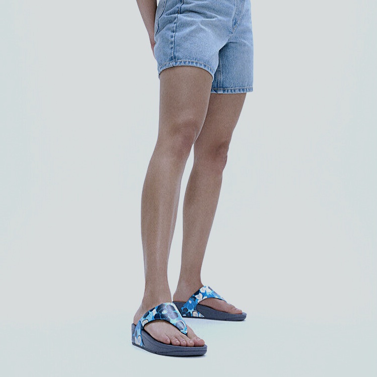 Slim V-strap toe-post with an IslandBloom print in layered blues. Feather-light platform rides on a CloudGlide midsole that diffuses pressure and supports natural arch. Soft toe post and smooth lining prevent rubs; gentle toe-spring keeps steps flowing. Micro-grip outsole stays steady in a midnight navy mix.